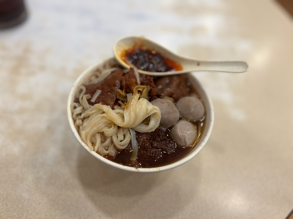 與華姐清湯牛腩不同,勝利牛丸的牛肉是用五香方式烹煮的。味道明顯較濃,但每一口都充滿了爆炸性的肉香和獨特的豐富口感。牛丸無疑是這碗麵的的靈魂之物。我加了一整勺店家特製的辣椒油,清碗,連湯都不剩。