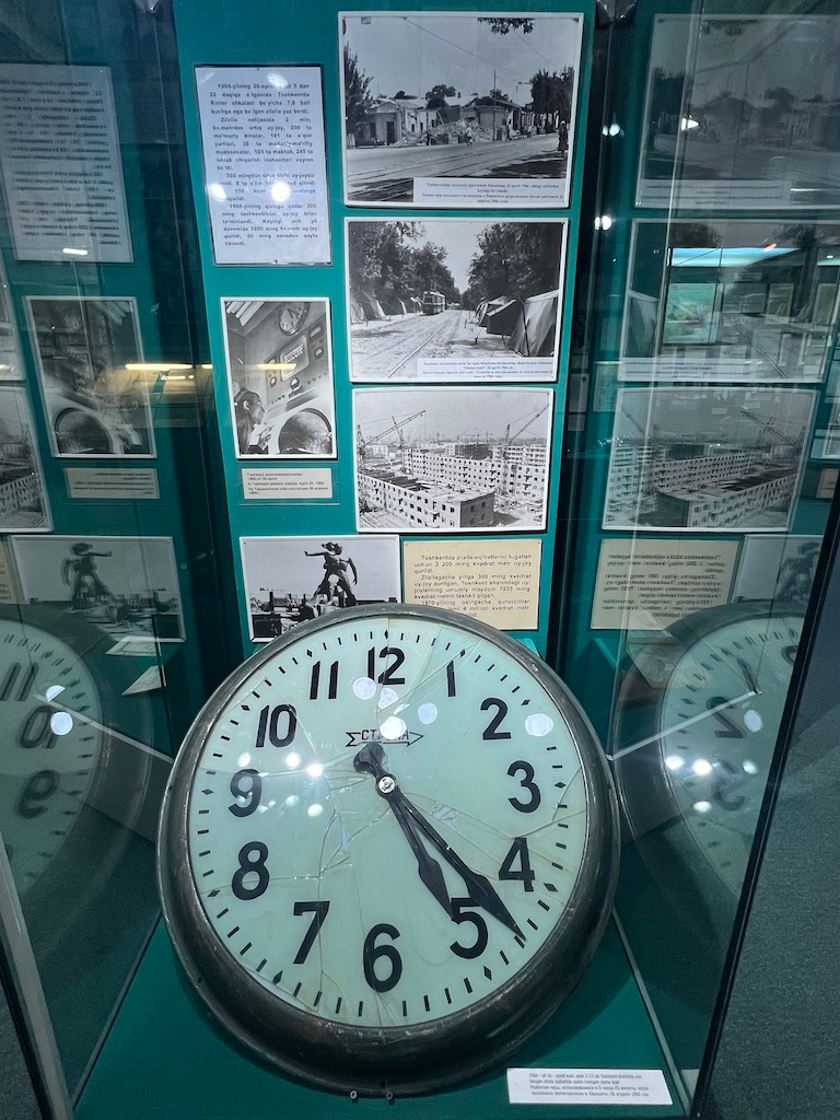 烏茲別克現代歷史上的一個決定性事件是1966年的大地震。博物館展示了一個在地震發生瞬間被地震破壞的鐘。這場5.2級地震重創了塔什干,摧毀了城市的大部分基礎設施,造成30萬居民流離失所。塔什干美麗的地鐵站是從地震中重建城市的一部分。在接下來的三年裏,整個城市的重建使居民的生活恢復到正常狀態。