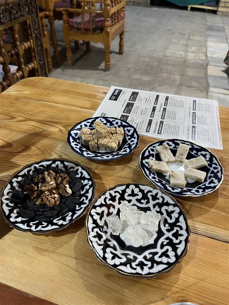 旁邊還有一盤美味的甜點。我特別喜歡芝麻系列,這種口味對我來說很熟悉,因為我們家鄉也是吃這些。他們的絲路甜點是絲綢之路茶舍的特色菜品,但因太甜,我覺得不太合口味。最後,茶館還提供了一盤核桃配葡萄乾,我很喜歡核桃的香味,這與香料茶的辛味非常搭配。