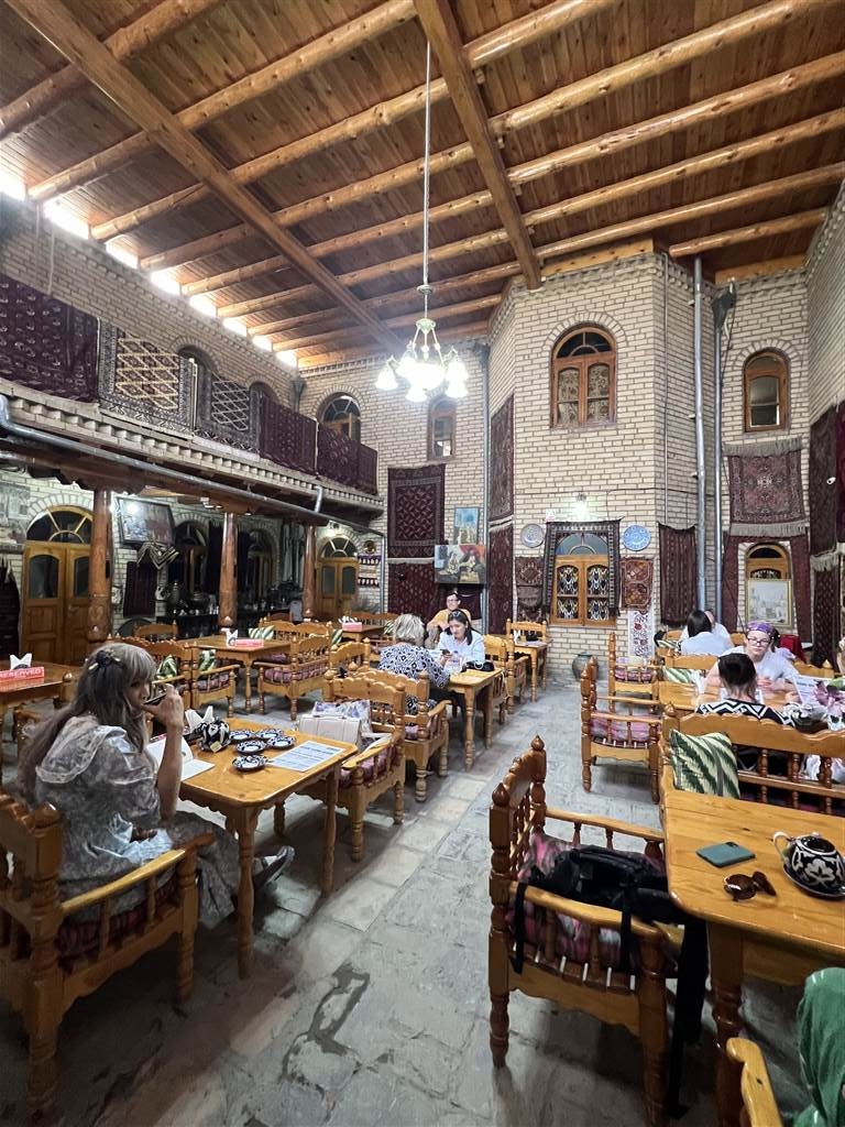 位於在卡利永清真寺群路途上的絲綢之路茶舍很受當地人和遊客的歡迎。在這個陰沉的下午,茶舍裡的桌子都滿人了。好幾張桌子已經被預訂,但幸運的是我們還能找到一張雙人桌。