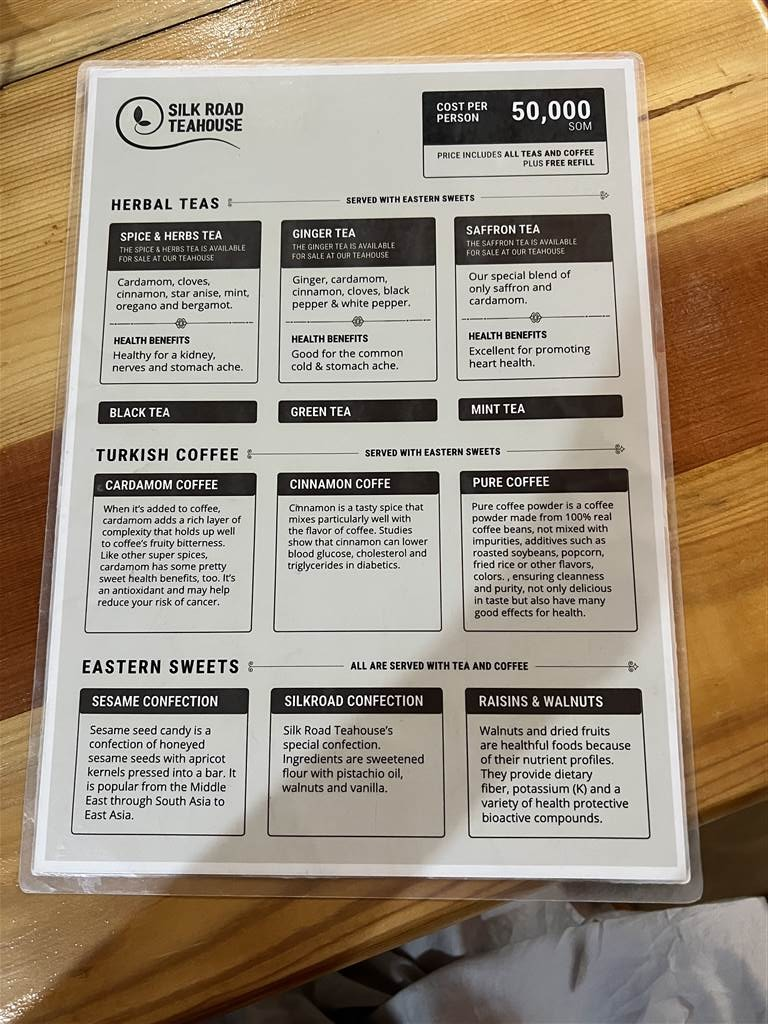 絲綢之路茶舍的所有點餐項目都是以套餐形式供應。每套茶點價格為 500,000 索姆。可以無限次為您的大茶壺加熱水。茶舍提供常規茶品,如紅茶、薄荷茶和綠茶。我想開眼界,因此選擇了豆蔻和藏紅花茶。對像我這樣的非本地人來說,香料茶確實是新奇的體驗。