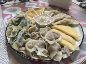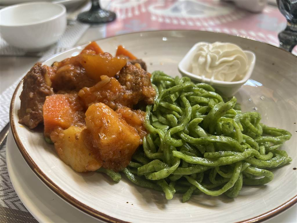 那裡的用餐氛圍很美好,有精心裝飾,展示了烏茲別克最精美的掛毯。在寬敞的餐廳裡,我們品嚐了傳統的烏茲別克菜餚,包括 chuchvara(烏茲別克餃子)和綠麵條(以蒔蘿製作,是 Khiva 的特色)。令人驚訝的是,我們所支付的價格與烏茲別克其他高檔餐廳的消費差不多,兩人約 20 至 25 美元。