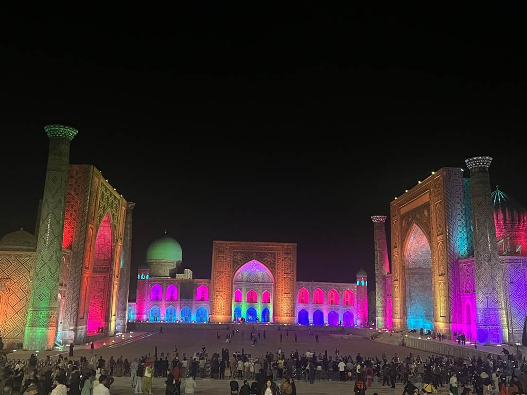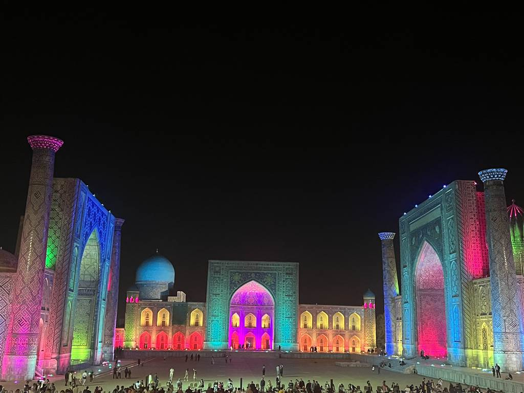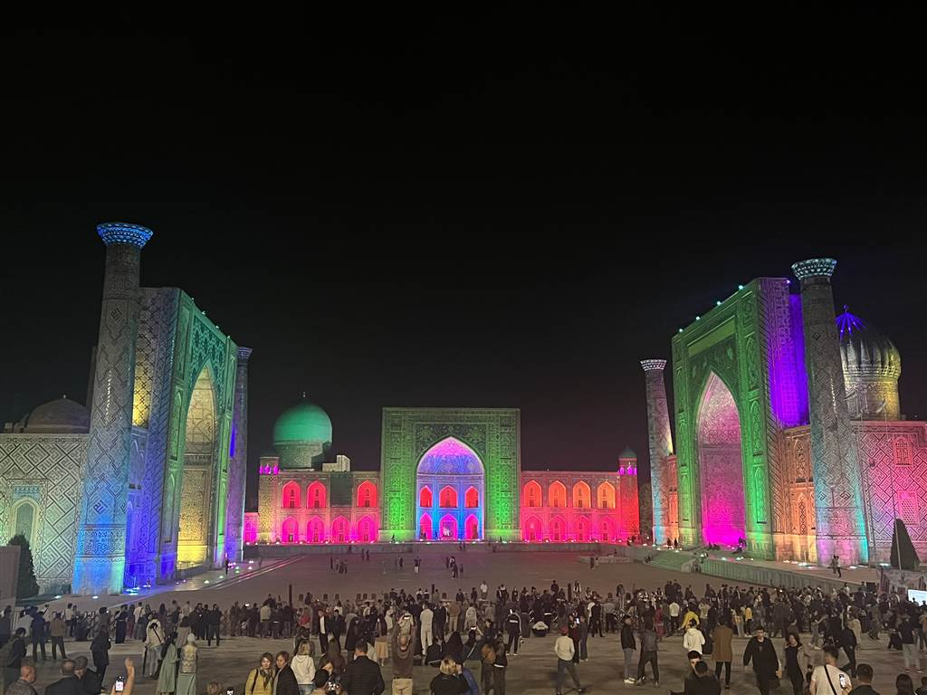 在較溫暖的月份,雷吉斯坦每晚都會點亮彩色光燈。燈光秀約在晚上八點到八點半開始,持續大約一個小時。燈光讓雷吉斯坦展現出不可思議的瑰麗一面。我們完全沉浸在伴隨的烏茲別克音樂中,音樂歌頌著撒馬爾罕。其中有一首歌整晚不斷在我們耳邊響起。除了反覆唱的“撒馬爾罕,撒馬爾罕”,我們聽不懂歌詞的任何其他部分。