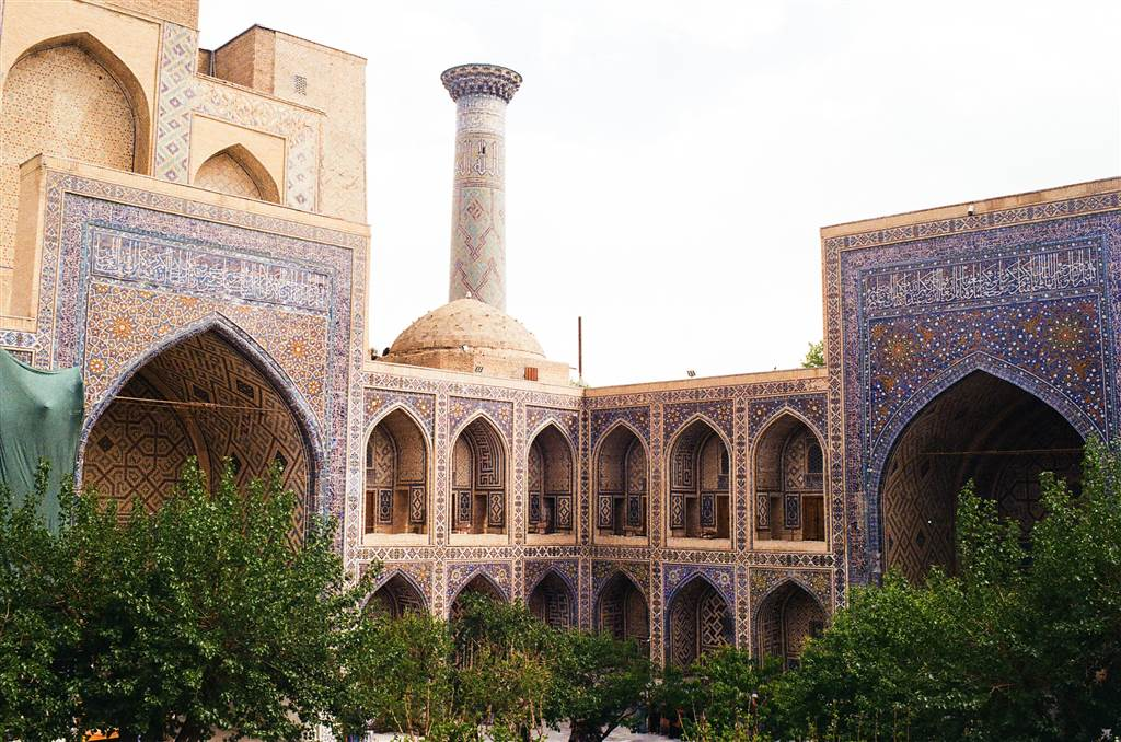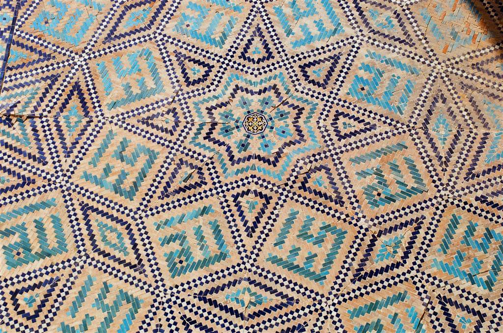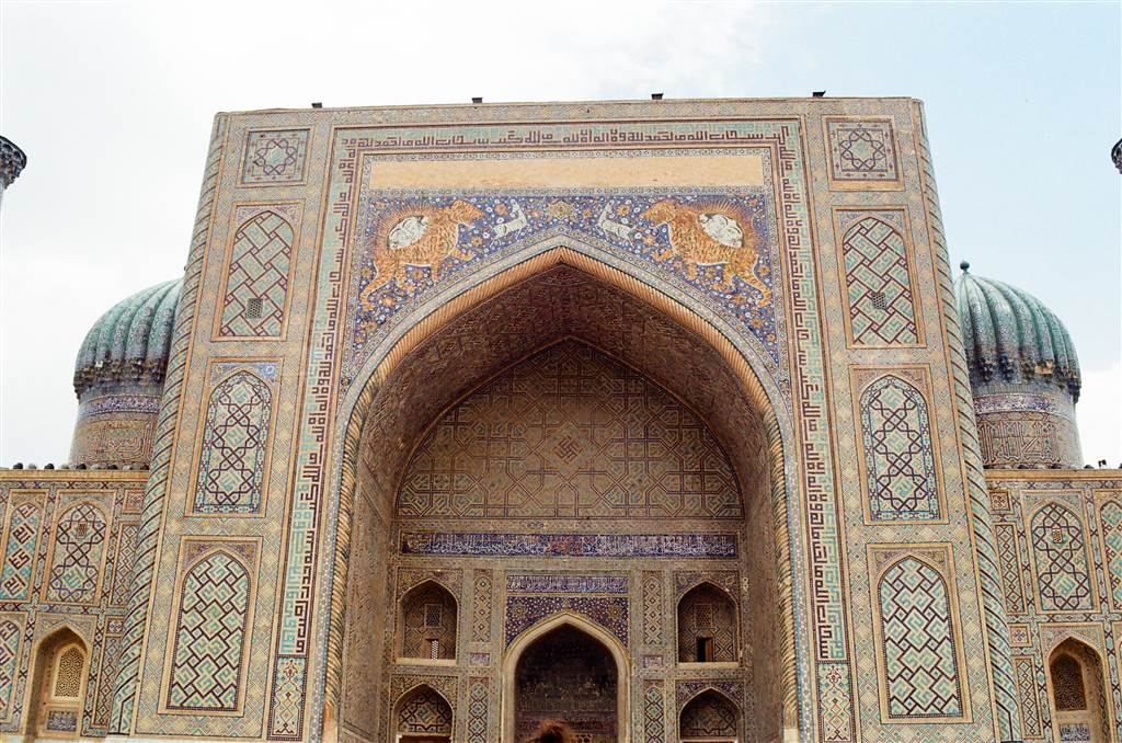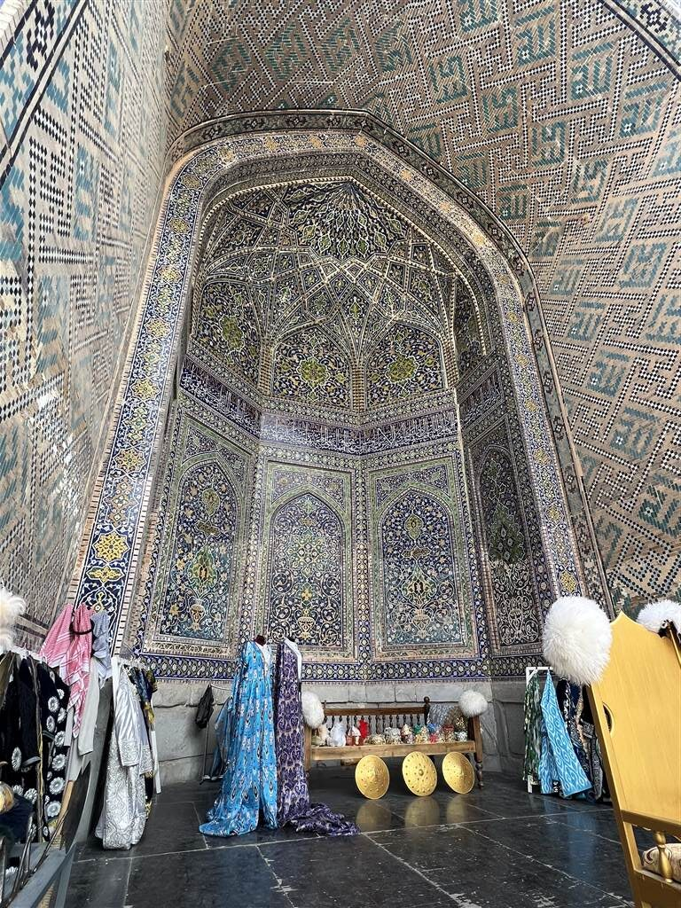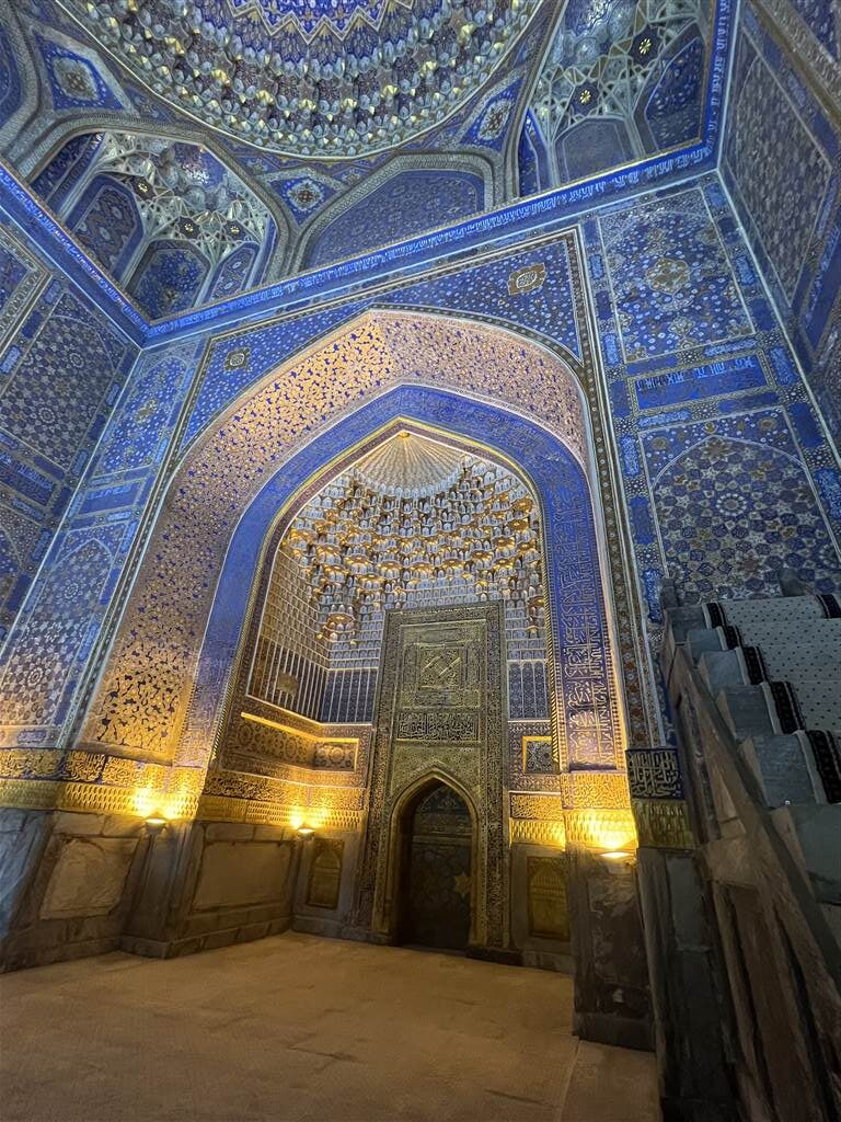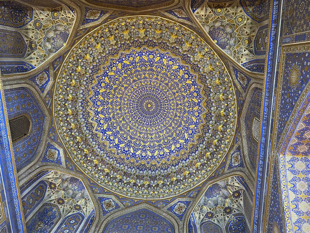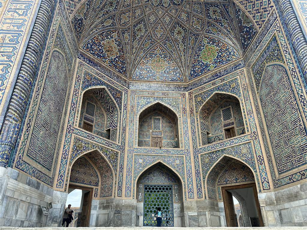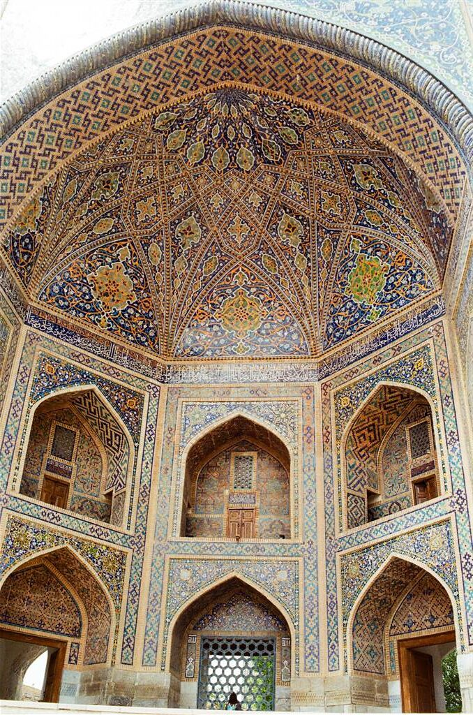 提利亞卡里學院的意思是「覆金學院」,在我看來,它的正門拱廊(pishtaq)擁有最精美的外觀。瓷磚馬賽克完整覆蓋了整個磚基,展現出奢華而精緻的圖案,與烏魯伯格學院的風格有所不同。