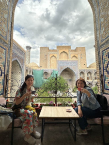 我們分別參觀了三個建築,到下午時,我們已經非常疲倦。在烏魯伯格學院的二樓有一家結合咖啡與紀念品的商店。我們決定找個桌子坐下,喝午後咖啡。店主告訴我們這裡是拍照的絕佳地點,於是他幫我們拍了幾張非常好的照片。能夠在撒馬爾罕壯麗景象的環抱中放鬆,真是不一樣的體驗。