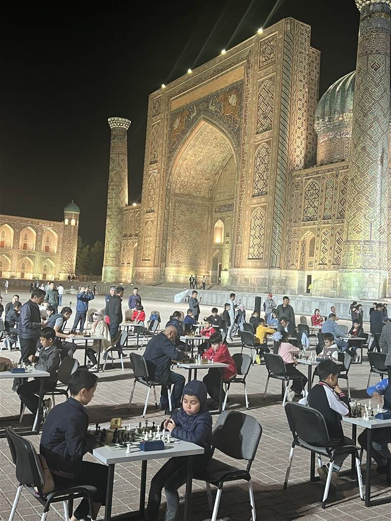 那天晚上,烏茲別克的民眾正在舉行一場國際象棋比賽。讓國際象棋成為文明氣息並以現代方式延續的,不是棋藝本身,因為鐵木爾本人就是一位認真的國際象棋愛好者。象棋之所以呈現現代氣息,是因為這場比賽。那晚在雷吉斯坦,我們親眼見證了社群的真諦。遊戲的精神將各行各業的人們聯繫在一起,男女老幼,都認真地下棋。雷吉斯坦隨著他們的驕傲之音協奏起舞。