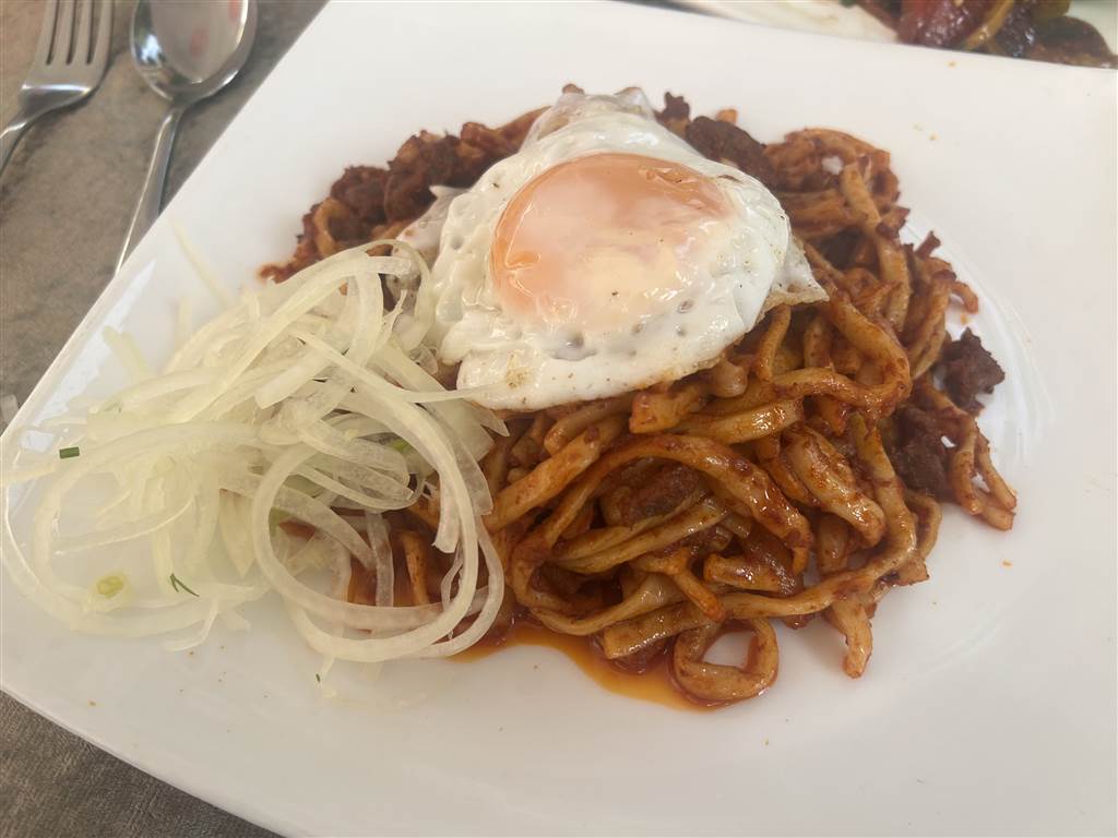 在布哈拉,我們吃了一種炒的拉赫曼麵,上面放了一個蛋黃流出的煎蛋,簡直是美味至極。在布哈拉,這道菜是必試的。