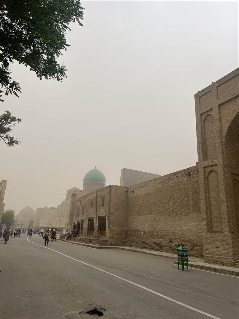 布哈拉的氣候就是沙漠氣候。在布哈拉的第二天,我們醒來時正好趕上了一場沙塵暴。我們已經離開綠洲精品酒店去進行當天的觀光,但決定折返房間拿我們的面罩。