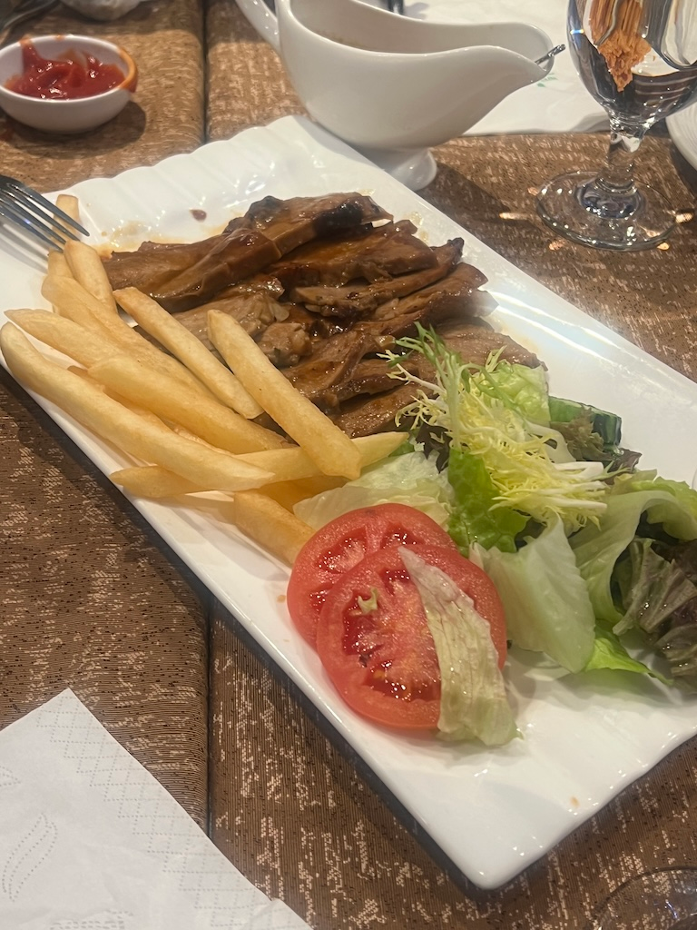 | 金福龍葡式牛扒茶餐廳 | G/F, 26 Travessa dos Becos, Avenida de Almeida Ribeiro | 這家餐廳顯然迎合了經常光顧議事亭前地和聖保羅大教堂遺址的遊客。它的菜餚很接近香港茶餐廳,有點像老式的融合菜。菜色一般,但也許是因為我不懂點什麼。 | 不推薦