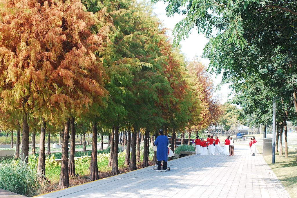 一排排的落羽杉葉子已經轉紅。