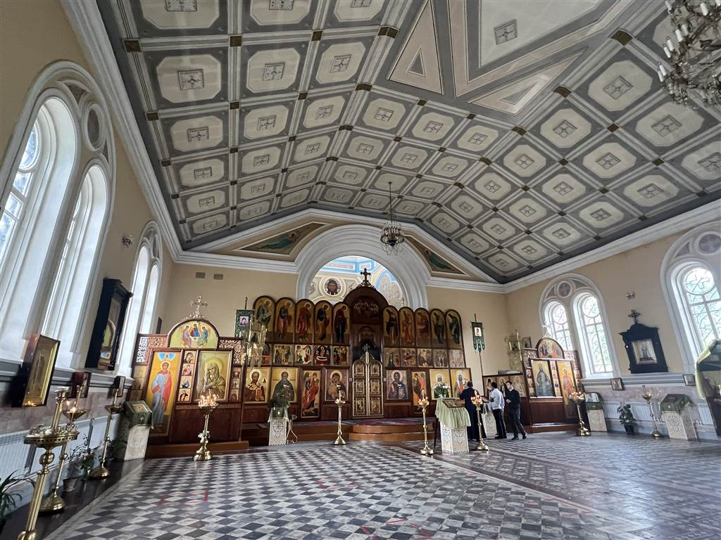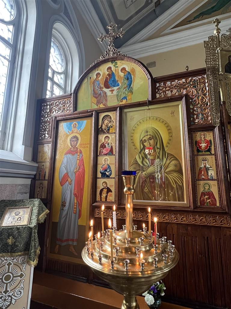 我認為這對任何教堂來說都是不尋常的顏色。我們是在復活節當日(依照西曆)去的。當時沒有舉行禮拜,但教堂是開放的,我們可以在裡面參觀。教堂內有漂亮的彩繪玻璃窗,整個空間都是寧謐。天花板鋪有白色調並帶有藍色圖案的瓷磚,教堂內的許多聖物展現出金色光澤。