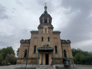 不過,我們確實找到了莫斯科大主教聖亞歷克修教堂,這座教堂位於Abdurahmon Jomiy Street街,離樹木成蔭的大學大道 (University Boulevard) 僅一街之隔。我們從側門進入。教堂的尖頂呈深綠色,有兩根粉紅色的柱子。